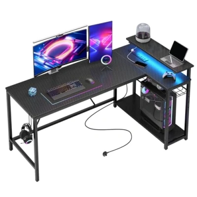 Convenient Charging: L-shaped desk with 3 power outlets and 2 USB ports for easy charging of gaming devices, controllers, laptops, or smartphones. Perfect for home office, gaming, or study sessions, keeping all your essential devices powered and within reach Carbon Fiber Gaming Desk: This corner desk features RGB strip lights under the monitor shelf, offering 7 colors and 22 display modes for an immersive experience. Set the perfect atmosphere for gaming or enjoy movies with a unique ambiance at home Spacious Storage Space: With dimensions of 147.5 D x 80 W x 91.5 H, this desk offers ample storage. The large desktop and thoughtful design help keep your workspace organized and clutter-free. Features a main tabletop, headphone hooks, and a removable computer stand Flexible Reversible Corner Desk: This L-shaped desk maximizes space, with double storage shelves that can be placed on either side to fit your habits and space planning. Keep files, books, and headsets within arm's reach for an organized and efficient workspace Easy to Assemble: Comes with labeled parts and illustrated instructions for a hassle-free setup. Each desk includes assembly instructions