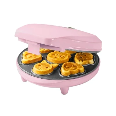 Decorative mini cookie maker for baking 7 sweet or savory waffle cookies with fun animal shapes – perfect for children’s birthdays, small snacks or Easter Quick heating within minutes, automatic temperature control including baking indicator light for optimal results Non-stick coating for easy removal of baked goods and simple cleaning, space-saving cable storage (cable length: 75 cm) Safe usage on the table with non-slip feet, heat-resistant housing with an insulated handle Contents: 1 Bestron Mini Cookie Maker, Power: 700 watts, Weight: 1.45 kg, Material: Plastic/Metal, Dimensions: 28 x 11.2 x 22.5 cm, Color: Pink, Model: AAW700P, Manufacturer: Smartwaresgroup