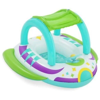 Inflatable spaceship-shaped boat for children, ideal from 3 years old. With a removable canopy for shade and a steering wheel with a horn, it offers comfort and fun. Made of PVC, it is lightweight (0.8 kg) and easy to inflate. Perfect for the pool or beach, it stimulates children's senses while familiarizing them with water.
