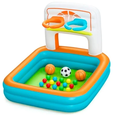 ManoManoThe BESTWAY Kick 'N Swish inflatable ball pit is perfect for children aged 2 and up. With its two basketball hoops and a soccer wall, it promises hours of entertainment. Dimensions: 120 cm x 107 cm x 84 cm, includes 18 multicolored balls.