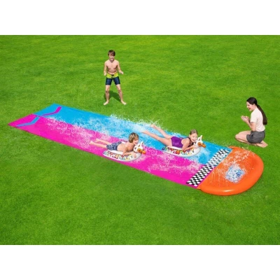 General description This Bestway H20GO Llama Rama Double Race Slide brings the fun of the race track right to your backyard! Featuring a vibrant design, this double slider includes two inflatable Llama surf riders that glide along the slide, enhanced by built-in sprinklers that keep the lanes slick for exciting racing fun. Measuring 16 feet in length, it's perfect for keeping kids entertained and cool during the summer, making it an ideal addition to any party.