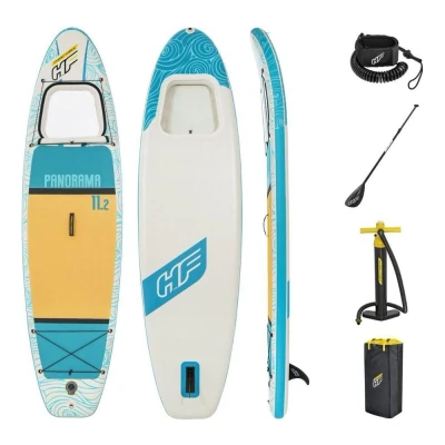 INFLATABLE SUP: the Hydro-Force Panorama is a complete inflatable paddle board set with board, backpack, hand pump, adjustable paddle, surf leash and detachable fin DESIGN: long and wide touring paddle board for stability, speed and comfortable rides on the water and includes a unique built-in viewing window to see into the water DUBRALE: lightweight but rigid drop stitch construction with marine grade, UV resistant, Tritech surface material built to withstand all types of adventures in all conditions FEATURES: double elastic cord for storage for when on the water, large non-slip traction pad for ultimate stability and a central carry handle for convenience COMPLETE SET: paddleboard, 1 paddle, 1 hand pump, 1 backpack, 1 coiled leash, 1 centre fin and repair kit. Inflated size: 3.40m x 89cm x 15cm (11ft. 2in. x 35in. x 6in.) with a max weight capacity of 150kg (330lbs)