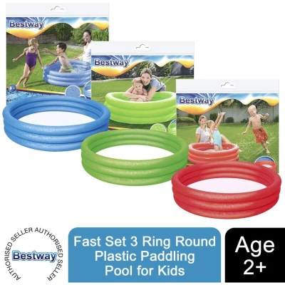 The Bestway inflatable swimming pool is designed for children over 2 years old. It measures 1.02 m x 25 cm and has three equal rings for stability. It can hold up to 101 L of water and is easy to assemble. This pool is ideal for small patios and backyards. Sold individually, color is random.