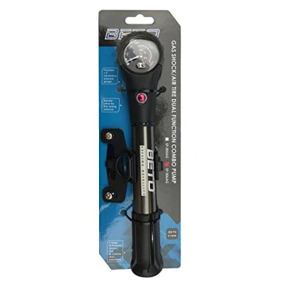 GAS SHOCK/ AIR TIRE DUAL FUNCTION COMBO PUMP DUAL BARREL/ DUAL PISTON OPPOSE-PUMPING SYSTEM 300PSI CAPABLE WITH FINE-TUNE BLEEDER VALVE 1.5 INCH INDUSTRY-CLASS PRESSURE GAUGE METAL HEAD FITS SCHRADER W/PRESTA ADAPTER