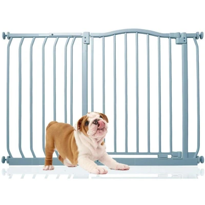 General description The Bettacare Matt Finish Curved Top Pet Gate is designed with the latest stair gate technology, providing a stylish and robust solution for pet owners. It is ideal for creating a secure barrier for dogs and puppies while enhancing the aesthetics of your home. Technical specifications Dimensions: 107cm - 116cm width Height of the curved top: 75.6cm from the floor Installation Pressure fitted, requiring no screws into walls Easy installation guide included Can only be installed in a straight line Usage Opens in either direction Features auto close technology for secure closure Stay open technology allows the gate to remain open beyond ninety degrees Quick check indicator alerts if the gate is securely locked or improperly installed