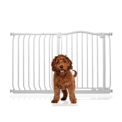 OVER 30 YEARS OF TRUST – Bettacare, has been dedicated to creating safe and secure spaces for children and pets for over three decades. Our commitment to safety and quality ensures that our products are rigorously tested to meet the highest current standards. With a legacy of trust and reliability, Bettacare is a name you can depend on for your family's safety needs. RELIABLE SAFETY - Crafted from durable materials, our products ensure long-lasting protection. Smooth, rounded edges prevent injuries, while finishes are lick-safe and bite-proof for ultimate safety. Our sturdy pet barriers feature robust and strong construction. Designed to prevent your pets from accessing unsafe areas and be simple and reliable for your family to use, all our pet barriers pass our stringent quality control and user testing, providing unparalleled security. Bettacare Curved Top Dog Gate, 116cm - 125cm COLOUR - White - Features a high-quality paint finish that is rigorously tested and certified to be free from harmful chemicals. This ensures a child-safe coating, providing peace of mind while maintaining a durable and attractive appearance. HEIGHT OF GATE - When installed - 75cm PRESSURE FIT TECHNOLOGY - Securely mounts the safety gate without the need for drilling, using a pressure-fit system that creates a strong and stable barrier by applying tension between the gate and the walls or door frames. @@@EVGU+/K+OB15B2DYpGPuvX5oIt8TX0SZ@@@ for easy installation and removal. NO GATE RESTRICTOR - Gate opens freely in both directions. OPEN GATE WARNING INDICATOR - Our visual indicator reassures you that the gate is correctly closed and secure, offering you peace of mind. AUTOMATIC CLOSING SYSTEM - The gate closes behind you for peace of mind and eliminates the worry of accidentally leaving the gate open. WIDE WALK-THROUGH - The spacious opening allows for easy passage, making it convenient for adults and older children. EASILY EXTENDABLE - The gate can be effortlessly extended with simple one-piece gate extensions, accommodating various doorway widths. STAY OPEN TECHNOLOGY - The gate can be fixed in the open position when pushed past 90 degrees, staying open until you decide to close it, offering convenience for busy households. ERGONOMIC HANDLE - Designed for comfortable and easy use, the handle ensures easy one-hand opening and closing. EASE OF INSTALLATION & STYLISH DESIGN - Our gates offer quick, simple installation with detailed instructions for a secure fit. The intuitive one-hand opening mechanism for adults and easy-to-close, secure locking system enhance user-friendliness. Stylish and high-quality designs complement your home interior, making our products highly rated for reliability and ease of use. A comprehensive warranty is included, reflecting our commitment to customer satisfaction and product excellence.