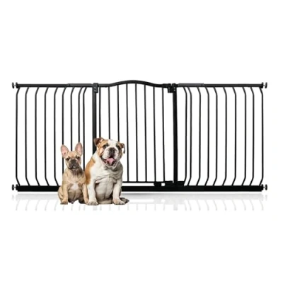 ManoManoGeneral description The Bettacare Matt Finish Curved Top Pet Gate is designed with the latest stair gate technology, providing a stylish and robust solution for pet owners. This pressure-fit gate is ideal for wider openings, ensuring both functionality and aesthetics. Technical specifications Height of the curved top: 75.6 cm from the floor Width: Adjustable between 170 cm and 179 cm Installation Pressure fitted, requiring no screws into walls Can be installed in a few minutes with an easy installation guide Note: Can only be installed in a straight line, whether purchased alone or with extensions Usage Opens in either direction Features auto close technology to ensure the gate is secured Stay open technology allows the opening panel to remain open beyond ninety degrees for easy access Quick check indicator technology alerts if the gate is securely locked or improperly installed