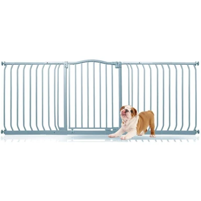ManoManoGeneral description The Bettacare Matt Finish Curved Top Pet Gate is designed with the latest stair gate technology, providing a stylish and robust solution for pet owners. It is ideal for wider openings and features a pressure fit installation that requires no screws, allowing for quick and easy setup. Technical specifications Dimensions: 188cm - 197cm width Height of the top curve: 75.6cm from the floor Installation Pressure fitted with no need to screw into walls Can be installed in a few minutes with an easy installation guide Can only be installed in a straight line if purchased alone or with extensions Usage Opens in either direction Features auto close technology to ensure the gate is secured Stay open technology allows the opening panel to remain open beyond ninety degrees for easy access Quick check indicator technology alerts if the gate is securely locked or improperly installed