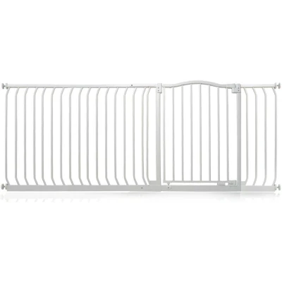 ManoManoGeneral description The Bettacare Matt Finish Curved Top Pet Gate is designed with the latest stair gate technology, providing a stylish and robust solution for pet owners. It is ideal for wider openings and features a pressure fit installation that requires no screws, allowing for quick and easy setup. Technical specifications Dimensions: 189cm - 198cm width Height of the top curve: 75.6cm from the floor Installation Pressure fitted with no need to screw into walls Can be installed in a few minutes using the provided installation guide Can only be installed in a straight line, whether purchased alone or with extensions Usage Opens in either direction Features auto close technology to ensure the gate is secured Stay open technology allows the opening panel to remain open beyond ninety degrees for easy passage when not in use Quick check indicator technology alerts if the gate is securely locked or improperly installed