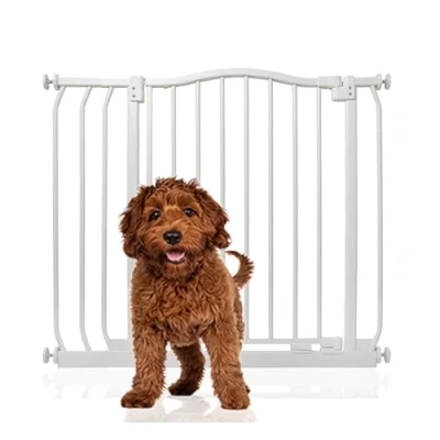 ManoManoGeneral description The Bettacare Matt Finish Curved Top Pet Gate is designed with the latest stair gate technology, providing a stylish and robust solution for pet owners. It is ideal for creating a barrier for dogs and puppies, ensuring safety and convenience in your home. Technical specifications Height of the curved top: 75.6 cm from the floor Width: Adjustable between 80 cm and 89 cm Installation Pressure fitted, requiring no screws into walls Can be installed in just a few minutes with an easy installation guide Note: Can only be installed in a straight line, whether purchased alone or with extensions Usage Opens in either direction for convenience Features auto close technology to ensure the gate is secured Stay open technology allows the opening panel to remain open beyond ninety degrees for easy passage when not in use Quick check indicator technology alerts users if the gate is securely locked or improperly installed