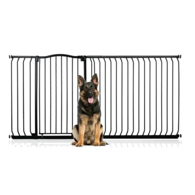 ManoManoGeneral description The Bettacare Extra Tall Matt Finish Curved Top Pet Gate is designed with the latest stair gate technology, providing a robust and stylish solution for pet owners. With a height of 100cm and a width adjustable between 189cm and 198cm, this gate is perfect for keeping your pets safe while maintaining an elegant look. Technical specifications Height: 100cm Width: Adjustable from 189cm to 198cm Finish: Matt Black Installation Pressure fitted, requiring no screws into the walls Can be installed in just a few minutes with an easy installation guide Note: Can only be installed in a straight line Usage Opens in either direction Features auto close technology to ensure the gate is secured Stay open technology allows the opening panel to remain open beyond ninety degrees for easy access Quick check indicator technology alerts if the gate is securely locked or improperly installed
