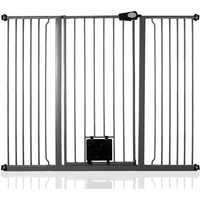 Bettacare Pet Gate with Lockable Cat Flap, 139.8cm 147.4cm, Slate Grey, 104cm in Height, Extra Tall Dog Safety Barrier Easy Installation