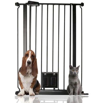 Bettacare Pet Gate with Lockable Cat Flap, 75cm 84cm, Black, 104cm in Height, Extra Tall Dog Safety Barrier Easy Installation
