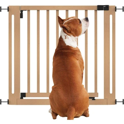 ManoManoGeneral description The Bettacare Wooden Elegance Dog Gate combines stylish elegance with versatility. Crafted from high-quality sustainable PEFC natural wood, this gate enhances your home’s decor while ensuring a safe environment for pets, as it is free from harmful chemicals. Its warm finish complements any interior, making it a sophisticated addition to any room. Designed for durability, the gate features robust, finger-safe construction and opens freely in both directions, equipped with a manual closing system for quick and secure locking. Technical specifications Dimensions: 87cm - 95cm (width) Extra wide doorway: 65cm Installation Pressure-fit technology allows for quick and hassle-free installation without drilling. Securely mounts to walls or door frames using tension. Usage Ergonomic handle for comfortable one-hand operation. Designed for daily use, providing convenience and peace of mind.
