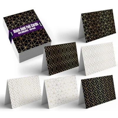 100-PACK - Bulk pack of 100 all-occasion greeting cards featuring 6 gold foil accented geometric designs; 3 designs on black, 3 designs on white - blank inside; complete with 100 white 32 lb. offset envelopes 6 COVER DESIGNS - Six geometric cover designs in gold foil, 3 with black backgrounds, 3 with white backgrounds BLANK INSIDE - Personalize each card as you wish HIGH-QUALITY CARDSTOCK - Each card is printed on 90 lb. cover stock, equivalent to 250 gsm BOXED SET - Cards and envelopes are packed into an attractive and sturdy Kraft corrugated box for protection and long-term storage.