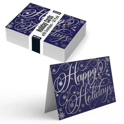Better Office Products 50 Pack Happy Holidays Cards with Silver Foil Accents, 5" x 7", High Gloss, Interior Greeting, Envelopes, Christmas Cards, New Years Count Boxed Set