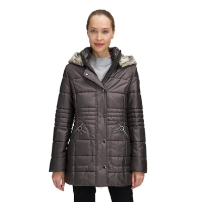 Cosy Betty Barclay women's jacket with soft plush trim for a stylish winter look. Slightly tailored fit for a feminine silhouette. Removable, width-adjustable hood and stand-up collar with ruffles for extra comfort. Zip with additional press stud closure for optimal protection. Practical zip pockets - perfect for everyday use and leisure.