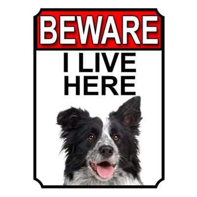 BEWARE I LIVE HERE METAL GATE SIGN BORDER COLLIE 200MM X 10MM (1045H1)