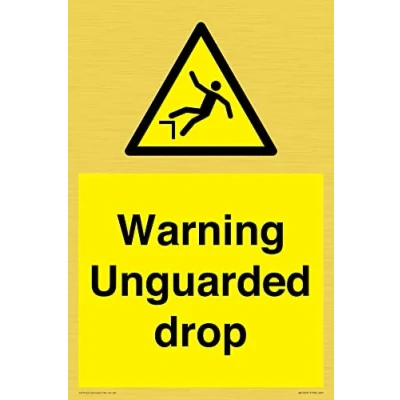 W008 : Drop (fall) This sign is made from vinyl gold sticker Gold metal effect sticker for flat, clean surfaces. Not for rough, plastic, or dusty surfaces. A4 portrait Sign Text: Warning Unguarded drop