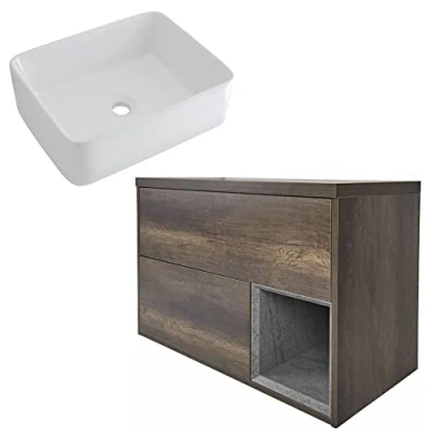AmazonFSC engineered wood and ceramic construction Dimensions: 800mm x 460mm x 636mm (vanity unit); 480mm x 370mm x 130mm (basin) Hard-wearing dark oak effect finish Includes vanity unit and basin You will need a wall-mounted or high-rise basin tap, unslotted or universal waste and flexible bottle trap Supplied ready assembled for easy installation