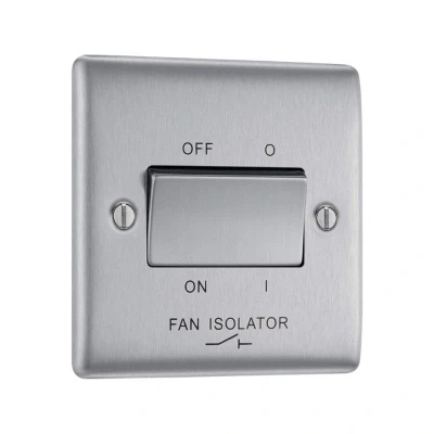 BG Nexus 3 Pole Fan Isolator Plate Switch - Brushed Steel (NBS15-01). 10A, 10AX inductive rated Captive terminal screws Terminal capacity 4 x 1.0mm, 4 x 1.5mm, 2 x 2.5mm and 1 x 4.0mm squared Minimum mounting box depth 16mm Genuine brand new NSS product, covered by a NSS manufacturer's guarantee.
