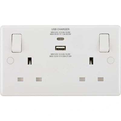 Good to know- This double socket with smart USB charging lets you power up all your devices quickly and safely, straight from the wall- Plug in a USB-C cable and charge your phone, tablet or even a laptop with up to 30 W USB-C Power Delivery- The USB Type-A port is great for quick-charging phones and other USB devices at up to 27 W- It's easy to install thanks to colour-coded terminals with captive screws, and there's a power switch for each socket- The white front plate is made of thermoset plastic, making it anti-microbial and fade-resistant