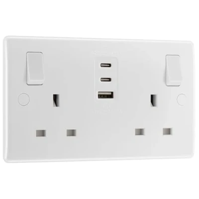 SLEEK AND SLIM WHITE MOULDED 13A DOUBLE SWITCHED USB POWER SOCKET: One Type A and two Type C USB ports featuring smart charging which intelligently adjust the voltage to give devices the power they need, when they need it, without overcharging. PART OF THE BG NEXUS 800 SERIES WHITE MOULDED RANGE: With stylish rounded corners and screw cover caps, and a high resistance to fading, discolouration and scratches, it gives a clean and non-obtrusive style, allowing it to complement any décor TRUST IN THE FAST CHARGE 30W USB FEATURES: Delivers 50% charge to mobile phones in just 30 minutes, charging up to 70% faster than standard 5V charging. Supports PD and QC charging protocols and outputs the best voltage & current for optimum charging CONVENIENTLY ANGLED IN-LINE CAPTIVE SCREW TERMINALS: Makes it incredibly easy to install and to connect the wires – even with the addition of the USB ports. Minimum mounting box depth 25mm, ideal for retro-fit TRUST IN THE BG ELECTRICAL USB RANGE: As they are guaranteed against faulty materials and workmanship for 10 years – giving you total peace of mind, Weight: 0.440924524 Pounds, Manufacturer: British General
