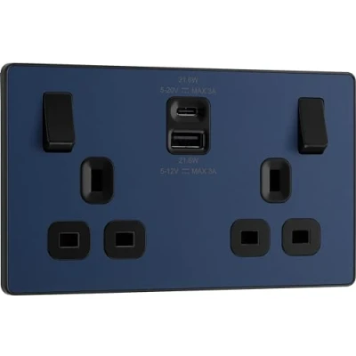 BG Electrical Double Switched Power Wall Plug Socket with Fast Charge Type A and C USB Charging Ports, Evolve, Matt Blue, 13A, 22W, PCDDB22UAC22B
