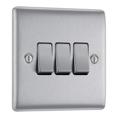 The BG Nexus Metal 3 Gang 2 Way Plate Switch is an elegant and practical solution for any lighting control needs, offering a blend of style, safety, and durability that will elevate the functionality and appearance of your spaces.