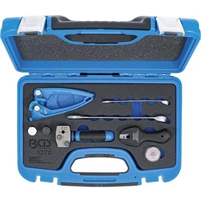 can be used also on mounted brake pipes suitable for brake pipes made of copper, aluminum and steel | flaring tool for flaring of 4.75 mm (3/16") brake pipes according DIN F braking pipe ratchet cutter for cutting 4.75 mm (3/16") brake pipes, cuts without rotating the tool completely around the pipe pipe bender for bending pipes with diameters 3 mm, 4,75 mm and 6 mm scope of delivery: flaring tool with 2-component handle |stop screw | flaring screw | flaring grease | brake pipe ratchet cutter (BGS 8339) | pipe bender (BGS 8228) |combination spanner 10 mm (BGS 30560) | combination spanner 17 mm (BGS 30567)