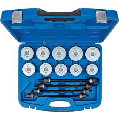 universal type for all car models also for assembly or disassembly of silent bearings, rubber- and ball bearings also suitable for rubber bushes and rotary shaft seals smooth running because of high-quality ball bearing on spindle screw nut four 350 mm spindles in M10, M12, M14 and M16 20 pressure pads (outer Ø x inner Ø): 44x34 - 46x36 - 48x38 - 50x40 - 52x42 - 54x44 - 56x46 - 58x48 - 60x50 - 62x52 - 64x54 - 66x56 - 68x58 - 70x60 - 72x62 - 74x64 - 76x66 - 78x68 - 80x70 - 82x72, Manufacturer: BGS