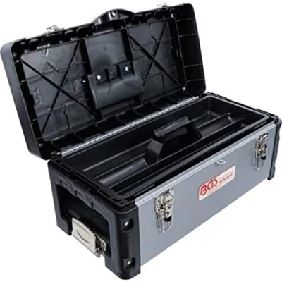 suitable for assembly trolley | mobile (BGS 2002) sturdy hard case made of impact-resistant plastic and sheet steel | ideal for e. g. assembly workers, mechanics, electricians, etc. can be closed at the side with two notches | 1 upper plastic handle multifunctional for different stowage options | with separate inner part with compartments for small parts dimensions: 500 x 220 x 230 mm