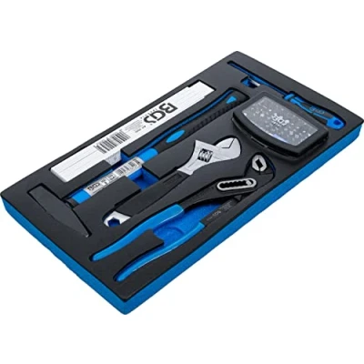 tool tray made from high-resistance foam width: 385 mm | height: 32 mm | depth: 215 mm suitable for the drawers of the: mobile assembly trolley (BGS 2002) | hard-top tool case attachment, 2 drawers (BGS 2002-3) compact set content, with machinist's hammer, bits, adjustable wrench and folding ruler | bits made of high quality chrome vanadium steel (S2), with intelligent color coding system for each profile scope of delivery: 1 water pump pliers, box-joint type, 240 mm (BGS 75111) | 1 color bit set, 32 pcs. (BGS 4816) | 1 spinner handle for bits, internal hexagon 6.3 mm (1/4"), 200 mm (BGS 217) | 1 machinist's hammer, fibreglas shaft, DIN 1041, 300 g (BGS 3852) |1 adjustable wrench with soft rubber handle, max. 25 mm (BGS 1441) | 1 wooden folding rule, 2 m (BGS 2053)
