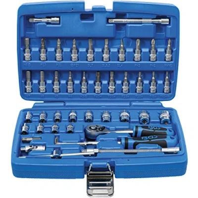extensively equipped for demanding mechanics as well as do-it-yourselfers | with hexagon sockets super lock in short version and bit sockets with different output profiles | high-quality fine-tooth reversible ratchet with 90 teeth, inserted reversible lever, ergonomic two-component handle and quick-release button for fast tool changes | contains among other things further diverse operating elements such as extension bars, sliding handle, spinner handle and universal joint | for covering various screwing applications, even in hard-to-reach areas clear arrangement for quick location of the desired screwing tool | safe and tidy storage in blow mold case | clear arrangement of the various sockets and bit inserts for quickly finding the required size | with knurling | sockets, extension bars, reversible ratchet, universal joint and spinner handle made of chrome vanadium steel | bit sockets made of high quality chrome vanadium steel (S2) | drive profile: internal square | drive profile size, metric: 6,3 mm | drive profile size, inch: 1/4" | surface finish: satin chrome plated | handle type: 2 component handle | no. of teeth in ratchet head: 90 scope of delivery: 13 sockets, super lock, 6.3 mm (1/4") drive: 4 mm (BGS 2344) - 4.5 mm (BGS 2339) - 5 mm (BGS 2345) - 5.5 mm (BGS 2343) - 6 mm (BGS 2346) - 7 mm (BGS 2347) - 8 mm (BGS 2348) - 9 mm (BGS 2349) - 10 mm (BGS 2350) - 11 mm (BGS 2351) - 12 mm (BGS 2352) - 13 mm (BGS 2353) - 14 mm (BGS 2354) | 6 bit sockets, 6.3 mm (1/4") drive, internal hexagon: 3 mm (BGS 2497) - 4 mm (BGS 2498) - 5 mm (BGS 2499) - 6 mm (BGS 2500) - 7 mm (BGS 2501) - 8 mm (BGS 2502) 3 bit sockets, 6.3 mm (1/4") drive, slot: SL 4 mm (BGS 2493) - 5.5 mm (BGS 2494) - 7 mm (BGS 2496) | 6 bit sockets, 6.3 mm (1/4") drive, T-star tamperproof (for torx): T10 (BGS 2357) - T15 (BGS 2358) - T20 (BGS 2359) - T25 (BGS 2360) - T30 (BGS 2362) - T40 (BGS 2363) | 3 bit sockets, 6.3 mm (1/4") drive, cross slot PH1 (BGS 2487) - PH2 (BGS 2488) - PH3 (BGS 2489) | 3 bit sockets, 6.3 mm (1/4") drive, cross slot PZ1 (BGS 2490) - PZ2 (BGS 2491) - PZ3 (BGS 2492) | 2 extension bars, 6.3 mm (1/4"): 50 mm (BGS 2336) - 100 mm (BGS 2335) 1 spinner handle, external square 6.3 mm (1/4"), 150 mm (BGS 216) | 1 sliding handle, external square 6.3 mm (1/4") (BGS 276) | 1 flexible extension bar, 6.3 mm (1/4"), 150 mm (BGS 2320) | 1 bit ratchet adaptor, ext. hexagon 6.3 mm (1/4") - ext. square 6.3 mm (1/4"), 30 mm (BGS 8202) | 1 universal joint, 6.3 mm (1/4") (BGS 250) | 1 reversible ratchet, fine tooth, 6.3 mm (1/4") (BGS 630) | 3 L-type wrenches, internal hexagon, 1.5 - 2 - 3 mm, Weight: 2.8880556322 pounds, Manufacturer: BGS technic KG