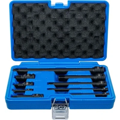 compact set composition with different drive and output profiles | for both manual and impact wrenches can be fixed on impact wrench by pin and O-ring | safe and tidy storage in blow mold case output profile: external square | drive profile: internal square surface finish: black burnished | material: chrome molybdenum steel scope of delivery: 1 impact extension bar, 6.3 mm (1/4"), 50 mm | 1 impact extension bar, 6.3 mm (1/4"), 100 mm | 1 impact extension bar, 6.3 mm (1/4"), 150 mm | 1 impact extension bar, 10 mm (3/8"), 50 mm | 1 impact extension bar, 10 mm (3/8"), 75 mm | 1 impact extension bar, 10 mm (3/8"), 150 mm | 1 impact extension bar, 12.5 mm (1/2"), 50 mm | 1 impact extension bar, 12.5 mm (1/2"), 125 mm (BGS 193) | 1 impact extension bar, 12.5 mm (1/2"), 250 mm (BGS 194), Weight: 3.5053499658 Pounds, Manufacturer: BGS
