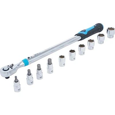universal set composition | suitable for tightening to torque for screwed connections with right-hand thread | integrated reversible ratchet with narrow head shape | ratchet mechanism, reversible | easy locking and unlocking at the handle optimally designed plastic handle for easy setting of the desired torque value, as well as a secure grip of the tool handle | clearly audible release tone | large viewing window with magnifying glass function optimizes readability | surface finish: satin chrome plated output profile: external square | drive profile size, metric: 12.5 mm | drive profile size, inch: 1/2" | of teeth in ratchet head: 48 | release accuracy: +/- 4 % torque: 200 Nm | torque: 40 Nm | length: 537 mm | fine scale: 0.5 Nm | trigger clockwise: yes | trigger counter clockwise: no scope of delivery: 1 torque wrench, 12.5 mm (1/2"), 40 - 200 Nm | 1 socket, hexagon, 12.5 mm (1/2") drive: 17 mm (BGS 2917) - 19 mm (BGS 2919) - 21 mm (BGS 2921) - 22 mm (BGS 2922) - 24 mm (BGS 2924) - 27 mm (BGS 2927) | 1 bit socket, 12.5 mm (1/2"), internal hexagon: 6 mm (BGS 4252) - 8 mm (BGS 4254) - 10 mm (BGS 4255) - 12 mm (BGS 4256), Weight: 6.5697754076 Pounds, Manufacturer: BGS