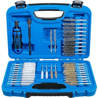 all brushes with 6.3 mm (1/4") drive for cleaning and deburring cylinders, bushings, pipes, etc. also for use on electric and air powered drills 12 nylon brushes Ø 8 - 9 - 10 - 11 - 12 - 13 - 14 - 15 - 16 - 17 - 18 - 19 mm 12 steel brushes Ø 8 - 9 - 10 - 11 - 12 - 13 - 14 - 15 - 16 - 17 - 18 - 19 mm 12 solid brass brushes Ø 8 - 9 - 10 - 11 - 12 - 13 - 14 - 15 - 16 - 17 - 18 - 19 mm 1 handle with 6.3 mm (1/4") drive and quick lock 1 extension bar 150 mm, Weight: 3.3730726086 Pounds, Manufacturer: BGS technic KG
