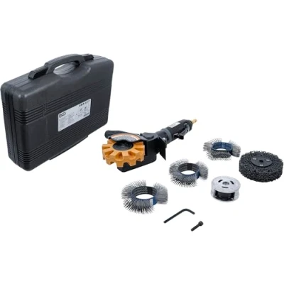 universal and multi-purpose multifunctional sanding tool | contains various tools such as brush belts, sanding discs and foil erasers for different applications for professional removal of rust, stickers, adhesive residues, paints and foils | suitable for smooth surfaces on vehicles and other surfaces made of aluminum, metal, glass and plastic powerful grinder reaches up to 4000 rotations per minute | ergonomic and cold-insulating handle for fatigue-free working | infinitely variable speed regulation via rotary control on the back of the handle | 180° adjustable handle free speed: 4000 rpm | output shaft: 9 mm | compressed air connection: 6.3 mm (1/4") | working pressure: 6.2 bar (90 PSI) | air consumption: 102 l/min (3.6 cfm) sound pressure level (LpA): 79 dB(A) | sound power level (LwA): 82 dB(A) | vibration level (ahd): 0.8 m/s² | vibration level (K): 0.1 m/s² | recommended hose diameter (internal): 10 mm (3/8") | length: 250 mm, Weight: 7.495716908 pounds, Manufacturer: BGS