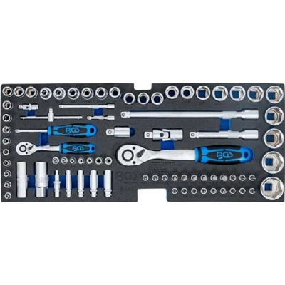 wide range of adapters and combinable extension bars offer different application options for many screwing and assembling jobs | tool tray made from high-resistance foam | the tools are protected in the hard foam tray and are stowed in the recesses in a non-slip manner | each individual tool has its appropriate place | sockets, extension bars, reversible ratchets, made of chrome vanadium steel | surface finish: satin chrome plated | bit sockets made of high quality chrome vanadium steel (S2) | suitable for the upper storage compartment of the metal tool case BGS: 3312, 3318 and 3350 scope of delivery: 12 sockets, hexagon, 6.3 mm (1/4") drive, 5/32" (BGS 10650) - 3/16" (BGS 10651) - 7/32" (BGS 10652) - 1/4" (BGS 10653) - 9/32" (BGS 10654) - 5/16" (BGS 10655) - 11/32" (BGS 10656) - 3/8" (BGS 10657) - 7/16" (BGS 10658) - 15/32" - 1/2" (BGS 10659) - 9/16" | 5 sockets, hexagon, deep, 6.3 mm (1/4") drive, 1/4" (BGS 10670) - 5/16" (BGS 10671) - 3/8" (BGS 10672) - 7/16" (BGS 10673) - 1/2" (BGS 10674) | 9 bit sockets, 6.3 mm (1/4") drive, internal hexagon: 3/32" (BGS 2740) - 1/8" (BGS 2741) - 5/32" (BGS 2742) - 3/16" (BGS 2743) - 7/32" (BGS 2744) - 1/4" (BGS 2745) - 9/32" (BGS 2746) - 5/16" (BGS 2747) - 3/8" (BGS 2748) 3 bit sockets, 6.3 mm (1/4") drive, slot SL: 4 mm (BGS 2493) - 5.5 mm (BGS 2494) - 6.5 mm (BGS 2495) | 6 bit sockets, 6.3 mm (1/4") drive, T-Star tamperproof (for Torx): T10 (BGS 2357) - T15 (BGS 2358) -T20 (BGS 2359) - T25 (BGS 2360) - T30 (BGS 2362) - T40 (BGS 2363) | 3 bit sockets, 6.3 mm (1/4") drive, cross slot: PH1 (BGS 2487) - PH2 (BGS 2488) - PH3 (BGS 2489) | 7 sockets, E-type, 6.3 mm (1/4") drive: E4 (BGS 6404) - E5 (BGS 6405) - E6 (BGS 6406) - E7 (BGS 6407) - E8 (BGS 6408) - E10 (BGS 6430) - E11 (BGS 6431) 20 sockets, hexagon, 12.5 mm (1/2") drive: 5/16" - 11/32" - 3/8" (BGS 2770) - 7/16" (BGS 2771) - 15/32" - 1/2" (BGS 2772) - 9/16" (BGS 2773) - 19/32" - 5/8" (BGS 2774) - 21/32" - 11/16" (BGS 2775) - 3/4" (BGS 2776) - 25/32" - 13/16" (BGS 2777) - 7/8" (BGS 2778) - 15/16" (BGS 2779) - 1" (BGS 2787) - 1.1/16" (BGS 2784) - 1.3/16" - 1.1/4" (BGS 2786) | 2 spark plug sockets, hexagon, 12.5 mm (1/2") drive: 16 mm (BGS 2472) - 21 mm (BGS 2470) | 2 extension bars, 6.3 mm (1/4"): 50 mm (BGS 2336) - 100 mm (BGS 2335) | 2 "wobble" extension bars, 12,5 mm (1/2"): 125 mm (BGS 246) - 250 mm (BGS 244) 1 sliding handle, external square 6.3 mm (1/4") (BGS 276) | 1 sliding adaptor for extension bars, external square 12.5 mm (1/2") (BGS 289) | | 1 spinner handle, external square 6.3 mm (1/4"), 150 mm (BGS 216) | 1 universal joint, 6.3 mm (1/4") (BGS 250) | 1 universal joint, 12.5 mm (1/2") (BGS 251) | 1 reversible ratchet, fine tooth, 6.3 mm (1/4") (BGS 618) | 1 reversible ratchet, fine tooth, 12.5 mm (1/2") (BGS 620), Weight: 10.8908357428 Pounds, Manufacturer: BGS