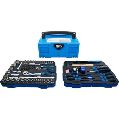 ideal basic tool equipment for the demanding mechanic as well as hand and do-it-yourselfer | with it's 77 parts this tool set offers a wide range of tools and is suitable for many applications | intelligent transport and storage system | one-handed operation: close, open and connect to other systainers | made of stable ABS plastic | functional handle and T-Loc closure | this case is part of a multi-component system, stackable (containers can be locked to another and carried) | protective padding in the upper lid | inside dimensions: width 383 mm, height 127.5 mm, depth 267 mm | splash-proof | sockets, extension bars, reversible ratchets, pliers made of chrome vanadium steel surface finish: satin chrome plated | screwdrivers and bit sockets made of high quality chrome vanadium steel (S2) | scope of delivery: 1 reversible ratchet, fine tooth, 6.3 mm (1/4") (BGS 618) | 1 reversible ratchet, fine tooth, 12.5 mm (1/2") (BGS 620) | 1 spinner handle, external square 6.3 mm (1/4"), 150 mm (BGS 216) | 1 sliding handle, external square 6.3 mm (1/4") (BGS 276) | 1 extension bar, 6.3 mm (1/4"): 50 mm (BGS 2336), 100 mm (BGS 2335) | 1 extension bar, 12.5 mm (1/2"): 125 mm (BGS 3120), 250 mm (BGS 3121) | 1 universal joint, 6.3 mm (1/4") (BGS 250) | 1 spark plug socket, hexagon, 12.5 mm (1/2") drive: 16 mm (BGS 2472), 21 mm (BGS 2470) 1 universal joint, 12.5 mm (1/2") (BGS 251) | 1 socket, hexagon, 6.3 mm (1/4") drive: 4 mm (BGS 2474), 4.5 mm (BGS 2475), 5 mm (BGS 2476), 5.5 mm (BGS 2477), 6 mm (BGS 2478), 7 mm (BGS 2479), 8 mm (BGS 2480), 9 mm (BGS 2481), 10 mm (BGS 2482), 11 mm (BGS 2483), 12 mm (BGS 2484), 13 mm (BGS 2485), 14 mm (BGS 2486) | 1 socket, hexagon, 12.5 mm (1/2") drive: 10 mm (BGS 2910), 11 mm (BGS 2911), 12 mm (BGS 2912), 13 mm (BGS 2913), 14 mm (BGS 2914), 15 mm (BGS 2915), 16 mm (BGS 2916), 17 mm (BGS 2917), 18 mm (BGS 2918), 19 mm (BGS 2919), 20 mm (BGS 2920), 21 mm (BGS 2921), 22 mm (BGS 2922), 24 mm (BGS 2924), 27 mm (BGS 2927), 30 mm (BGS 2930), 32 mm (BGS 2932) 1 bit socket, 6.3 mm (1/4") drive, T-Star (for Torx): T10 (BGS 2590), T15 (BGS 2591), T20 (BGS 2592), T25 (BGS 2593), T30 (BGS 2595), T40 (BGS 2596) | 1 bit socket, 6.3 mm (1/4") drive, slot: SL 4 mm (BGS 2493), 5.5 mm (BGS 2494), 6.5 mm (BGS 2495), 7 mm (BGS 2496) | 1 bit socket, 6.3 mm (1/4") drive, cross slot: PH1 (BGS 2487), PH2 (BGS 2488), PH3 (BGS 2489), PZ1 (BGS 2490), PZ2 (BGS 2491), PZ3 (BGS 2492) | 1 bit socket, 6.3 mm (1/4") drive, internal hexagon: 3 mm (BGS 2497), 4 mm (BGS 2498), 5 mm (BGS 2499), 6 mm (BGS 2500), 7 mm (BGS 2501), 8 mm (BGS 2502) | 1 foam tray for BGS BOXSYS1 and 2, empty, for BGS 3351 (BGS 3351-1) | 1 cob led head lamp (BGS 85314) 1 screwdriver, slot SL 4 mm, blade length 80 mm (BGS 4929) | 1 screwdriver, slot SL 5.5 mm, blade length 125 mm (BGS 4930) | 1 screwdriver, slot SL 6.5 mm, blade length 150 mm (BGS 4931) | 1 screwdriver, cross slot PH1, blade length 80 mm (BGS 4935) | 1 screwdriver, cross slot PH2, blade length 100 mm (BGS 4936) | 1 voltage tester, 120 - 250 V, 140 mm (BGS 725) | 1 combination pliers, 175 mm (BGS 370) | 1 water pump pliers, box-joint type, 240 mm (BGS 75111) | 1 swedish diagonal side cutter, 165 mm (BGS 393) | 1 machinist's hammer, hickory handle, DIN 1041, 300 g (BGS 52303) |1 measuring tape, 19 mm x 5 m (BGS 8394) | 1 foam tray for BGS BOXSYS1 and 2, empty, for BGS 3353 (BGS 3353-1), Weight: 18.49237453656 Pounds, Manufacturer: BGS