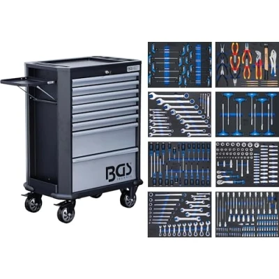 heavy duty workshop finish | stable sheet steel construction | powder-coated body, particularly resistant to scratches | heavy-duty, ball-bearing castors, including 2 lockable swivel castors | with side handle for easy maneuvering | lockable with a central lock with adjustable side shelf (254 x 275 mm) | continuous handle strips | edge protection on all four corners | stable plastic support with 5 storage compartments, load capacity up to 50 kg | sealed upper work surface protects the interior of the workshop trolley from leaking liquids 8 smooth-running drawers with ball-bearing slides: 1st to 6th drawer capacity up to 20 kg (each drawer), 7th to 8th drawer capacity up to 25 kg (each drawer) | number of drawers: 8 | drawer extension: 100% | drawer width: 569 mm | drawer depth: 409 mm | drawer height: 6 x 54 mm, 1 x 170 mm, 1 x 228 mm | drawer width (internal dimension): 560.4 mm | drawer depth (internal dimension): 407.8 mm | drawer height (internal dimension): 6 x 41.3 mm, 1 x 154.8 mm, 1 x 212.8 mm castor diameter: 125 mm | castor width: 48 mm | wall thickness body: 1.2 mm | wall thickness drawers: 0.8 mm | total capacity: 220 kg | height: 1026.5 mm | width: 724 mm | depth: 470 mm scope of delivery: 1 workshop trolley, 8 drawers, empty (BGS 4107) | 1 tool tray 3/3: screwdriver set with t-handle | internal hexagon, t-star (for torx), 18 pcs. (BGS 4148) | 1 tool tray 3/3 pliers, pin punch set, hammer, 17 pcs. (BGS 4011) | 1 tool tray 3/3 combination spanners and E-Type spanners assortment, 22 pcs. (BGS 4012) | 1 tool tray 3/3: t-handle socket set, 9 pcs. (BGS 4192) | 1 tool tray 3/3 screwdriver set, 23 pcs. (BGS 4014) | 1 tool tray 3/3 socket set, 80 pcs. (BGS 4015) | 1 tool tray 3/3 double open end spanner, double ring spanner, ratchet wrench, 26 pcs. (BGS 4016) | 1 tool tray 3/3 bit and bit socket, 104 pcs. (BGS 4017)