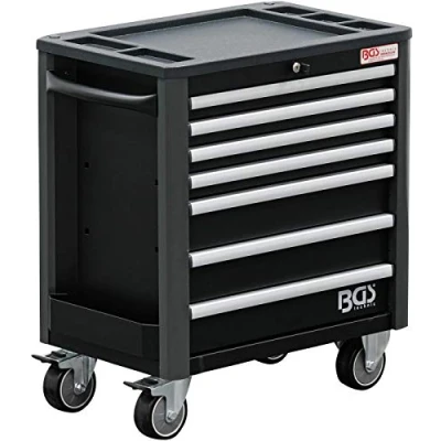 heavy duty workshop finish wall thickness body: 1.2 mm | wall thickness drawers: 0.8 mm low height: 85.9 cm heavy duty 125 mm ball bearing castors, thereof 2 castors lockable lockable through central lock 7 smooth running, ball bearing drawers: drawer 1 - 4 capacity: each 25 kg, drawer 5 - 7 capacity: each 30 kg | drawer pull-out: 100 % | drawer width: 569 mm | drawer height: 4 x 53 , 3x 111 mm | drawer depth: 409 mm each drawer individually secured, with safety lock work plate with 5 storage compartments side storage compartment: 78 x 370 x 75 mm (HxWxD) | side mounted handle height: 859 mm | width: 724 mm | depth: 470 mm | weight: 62 kg, Manufacturer: BGS technic