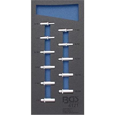 made of chrome vanadium steel Pro torque finish, deep knurled sockets, deep, internal square drive 6.3 mm (1/4"): 3/16" - 7/32" - 1/4" - 9/32" - 5/16" - 11/32" - 3/8" - 13/32" - 7/16" - 15/32" - 1/2" surface finish: satin chrome plated width: 189 mm | height: 32 mm | depth: 408 mm, Weight: 0.7495716908 Pounds, Manufacturer: BGS technic