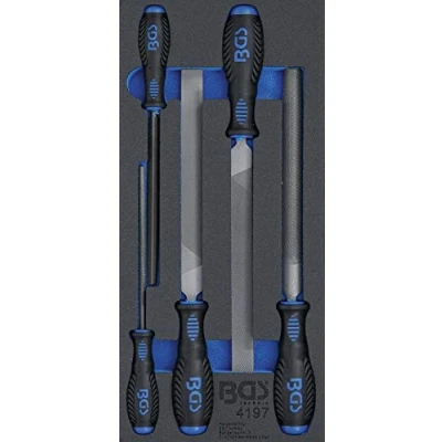 non-slip 2-component handle | DIN 7261 scope of delivery: 1 tool tray 1/3, empty, for bgs 4197 (BGS 4197-1) | 1 machinist's file, hand, 1st cut, 200 mm (BGS 6550) 1 machinist's file, hand, 2nd cut, 200 mm (BGS 6551) | 1 machinist's file, halfround, 1st cut, 200 mm (BGS 6553) 1 machinist's file, triangular, 2nd cut, 150 mm | 1 machinist's file, round, 1st cut, 150 mm (BGS 6576) width: 189 mm | height: 32 mm | depth: 408 mm | height of the insert without tools: 32 mm, Weight: 1.9400679056 pounds, Manufacturer: BGS