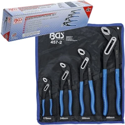 made of chrome vanadium steel safety handles | forged and hardened black lacquered finish | polished jaws and joint handles dip insulated | packed in a tetron wallet scope of delivery: 1 waterpump pliers 175 mm, max. opening width: 27 mm | 1 waterpump pliers 240 mm, max. opening width: 38 mm | 1 waterpump pliers 300 mm, max. opening width: 44 mm | 1 waterpump pliers 400 mm, max. opening width: 80 mm, Weight: 6.07153069548 pounds, Manufacturer: BGS