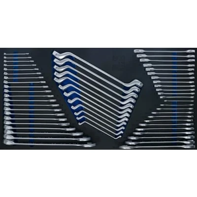 multi purpose combination spanner, double ring spanner, double open end spanner and ratchet combination wrench set with standard sizes - extensively equipped for demanding mechanics as well as do-it-yourselfers - combination spanner according DIN 3113, deep offset double ring spanners according DIN 838 and duoble open end spanner according DIN 3110 - fine-toothed with 72 teeth - ring ratchet mechanism with 5° ratcheting angle tool tray made from high-resistance foam - the tools are protected in the hard foam tray and are stowed in the recesses in a non-slip manner - each individual tool has it`s appropriate place - clear arrangement of the various components to find the required tool quickly - suitable for workshop trolley XL - 7 drawers - empty (BGS 4205) - material: chrome vanadium steel - surface finish: satin chrome plated scope of delivery:cope of delivery: 1 combination spanner, 6 mm - 1 combination spanner, 7 mm - 1 combination spanner, 8 mm - 1 combination spanner, 9 mm - 1 combination spanner, 10 mm - 1 combination spanner, 11 mm - 1 combination spanner, 12 mm - 1 combination spanner, 13 mm - 1 combination spanner, 14 mm - 1 combination spanner, 15 mm - 1 combination spanner, 16 mm - 1 combination spanner, 17 mm - 1 combination spanner, 18 mm - 1 combination spanner, 19 mm - 1 combination spanner, 20 mm - 1 combination spanner, 21 mm - 1 combination spanner, 22 mm - 1 combination spanner, 24 mm - 1 combination spanner, 27 mm - 1 combination spanner, 30 mm - 1 combination spanner, 32 mm 1 double ring spanner, deep offset ends, 6 x 7 mm - 1 double ring spanner, deep offset ends, 8 x 9 mm - 1 double ring spanner, deep offset ends, 10 x 11 mm - 1 double ring spanner, deep offset ends, 12 x 13 mm - 1 double ring spanner, deep offset ends, 14 x 15 mm - 1 double ring spanner, deep offset ends, 16 x 17 mm |1 double ring spanner, deep offset ends, 18 x 19 mm - 1 double ring spanner, deep offset ends, 20 x 22 mm - 1 double ring spanner, deep offset ends, 21 x 23 mm |1 double ring spanner, deep offset ends, 24 x 27 mm - 1 double ring spanner, deep offset ends, 25 x 28 mm - 1 double ring spanner, deep offset ends, 30 x 32 mm, Weight: 25.65739805156 pounds, Manufacturer: BGS