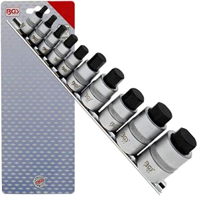 made of chrome vanadium steel knurled on socket rail bit sockets, length: 30 mm, 6.3 mm (1/4") drive, internal hexagon 4 - 5 - 6 - 7 - 8 mm bit sockets, length: 38 mm, 10 mm (3/8") drive, internal hexagon 10 - 12 - 14 mm bit sockets, length: 48 mm, 12.5 mm (1/2") drive, internal hexagon 17 - 19 mm, Weight: 1.1464037624 Pounds, Manufacturer: BGS