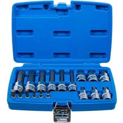 compact set composition with different drive and output profiles | for manual operation | knurled | safe and tidy storage in blow mold case output profile: spline (for XZN) | material: chrome vanadium steel (S2) | drive profile: internal square scope of delivery: 1 bit socket, 6.3 mm (1/4") drive, spline (for XZN) M4 (BGS 5105-M4) | 1 bit socket, 6.3 mm (1/4") drive, spline (for XZN) M5 (BGS 5105-M5) | 1 bit socket, 6.3 mm (1/4") drive, spline (for XZN) M6 (BGS 5105-M6) | 1 bit socket, 6.3 mm (1/4") drive, spline (for XZN) M8 (BGS 2503) | 1 bit socket, 6.3 mm (1/4") drive, spline (for XZN) M10 (BGS 2506) | 1 bit socket, 6.3 mm (1/4") drive, spline (for XZN) M12 (BGS 2507) 1 bit socket, 12.5 mm (1/2") drive, spline (for XZN) M8 (BGS 4352) | 1 bit socket, 12.5 mm (1/2") drive, spline (for XZN) M10 (BGS 4353) | 1 impact bit socket, 12.5 mm (1/2") drive, spline (for XZN) M12 (BGS 4354) | 1 bit socket, 12.5 mm (1/2") drive, spline (for XZN) M14 (BGS 4344) | 1 bit socket, 12.5 mm (1/2") drive, spline tamperproof (for XZN) M16 (BGS 4356) | 1 bit socket, 12.5 mm (1/2") drive, spline tamperproof (for XZN) M18 1 bit socket, length 100 mm, 12.5 mm (1/2") drive, spline (for XZN), M8 (BGS 4361) | 1 bit socket, length 100 mm, 12.5 mm (1/2") drive, spline (for XZN), M10 (BGS 4362) | 1 bit socket, length 100 mm, 12.5 mm (1/2") drive, spline (for XZN), M12 (BGS 4363) | 1 bit socket, length 100 mm, 12.5 mm (1/2") drive, spline (for XZN), M14 (BGS 4364) | 1 bit socket, length 100 mm, 12.5 mm (1/2") drive, spline (for XZN), M16 | 1 bit socket, length 100 mm, 12.5 mm (1/2") drive, spline (for XZN), M18, Manufacturer: BGS