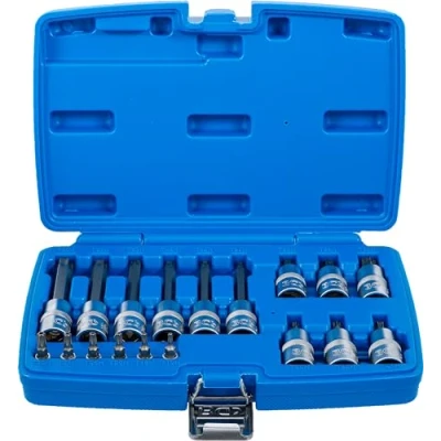 compact set composition with different drive and output profiles | for manual operation | knurled | safe and tidy storage in blow mold case output profile: T-Star tamperproof (for Torx) | material: chrome vanadium steel (S2) | drive profile: internal square | surface finish: satin chrome plated scope of delivery: 1 bit socket, 6.3 mm (1/4") drive, t-star tamperproof (for Torx) T10 (BGS 2357) | 1 bit socket, 6.3 mm (1/4") drive, t-star tamperproof (for Torx) T15 (BGS 2358) | 1 bit socket, 6.3 mm (1/4") drive, t-star tamperproof (for Torx) T20 (BGS 2359) | 1 bit socket, 6.3 mm (1/4") drive, t-star tamperproof (for Torx) T25 (BGS 2360) | 1 bit socket, 6.3 mm (1/4") drive, t-star tamperproof (for Torx) T27 (BGS 2361) | 1 bit socket, 6.3 mm (1/4") drive, t-star tamperproof (for Torx) T30 (BGS 2362) 1 bit socket, 12.5 mm (1/2") drive, t-star tamperproof (for Torx) T30 | 1 bit socket, 12.5 mm (1/2") drive, t-star tamperproof (for Torx) T40 (BGS 4326) | 1 bit socket, 12.5 mm (1/2") drive, t-star tamperproof (for Torx) T45 (BGS 4327) | 1 bit socket, 12.5 mm (1/2") drive, t-star tamperproof (for Torx) T50 (BGS 4328) | 1 bit socket, 12.5 mm (1/2") drive, t-star tamperproof (for Torx) T55 (BGS 4329) | 1 bit socket, 12.5 mm (1/2") drive, t-star tamperproof (for Torx) T60 (BGS 4376) 1 bit socket, length 100 mm, 12.5 mm (1/2") drive, t-star tamperproof (for Torx) T30 | 1 bit socket, length 100 mm, 12.5 mm (1/2") drive, t-star tamperproof (for Torx) T40 | 1 bit socket, length 100 mm, 12.5 mm (1/2") drive, t-star tamperproof (for Torx) T45 | 1 bit socket, length 100 mm, 12.5 mm (1/2") drive, t-star tamperproof (for Torx) T50 | 1 bit socket, length 100 mm, 12.5 mm (1/2") drive, t-star tamperproof (for Torx) T55 | 1 bit socket, length 100 mm, 12.5 mm (1/2") drive, t-star tamperproof (for Torx) T60, Manufacturer: BGS