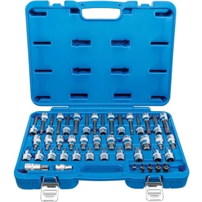 made of chrome vanadium steel 10 bit sockets, length 55 mm, 12.5 mm (1/2") drive, T-Star (for Torx): T20 - T25 - T27 - T30 - T40 - T45 - T50 - T55 - T60 - T70 6 bit sockets, length 100 mm, 12.5 mm (1/2") drive, T-Star (for Torx): T25 - T30 - T40 - T45 - T50 - T60 9 bit sockets, length 55 mm, 12.5 mm (1/2") drive, internal hexagon: 5 - 6 - 7 - 8 - 10 - 12 - 14 - 17 - 19 mm 5 bit sockets, length 100 mm, 12.5 mm (1/2") drive, internal hexagon: 6 - 7 - 8 - 10 - 12 mm 4 bit sockets, length 55 mm, 12.5 mm (1/2") drive, spline (for XZN): M5 - M6 - M8 - M10 5 bit Sockets, length 100 mm, 12.5 mm (1/2") drive, spline (for XZN): M6 - M8 - M10 - M12 - M14 9 bits, length 30 mm, 8 mm (5/16") drive, T-Star tamperproof (for Torx) T20 - T25 - T27 - T30 - T40 - T45 - T50 - T55 - T60 1 bit adaptor with retaining ball, 12.5 mm (1/2") drive, internal hexagon 8 mm (5/16"), Weight: 11.0231131 pounds, Manufacturer: BGS